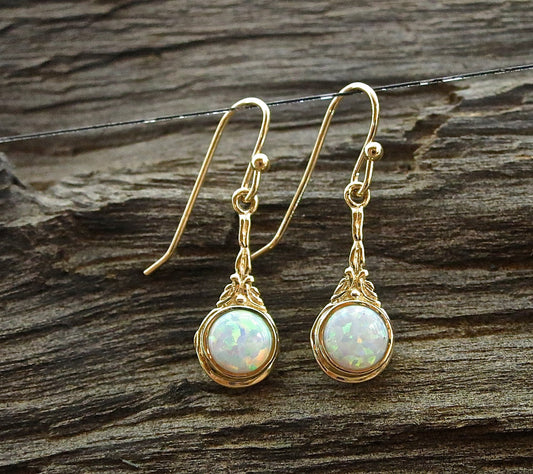 Opal earrings, 14k solid gold blue opal dangle earrings victorian style