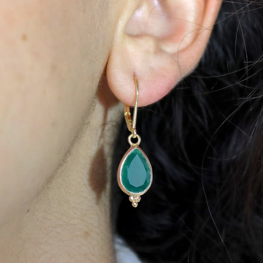 Green Amethyst earrings, Teardrop green stone gold dangle earrings