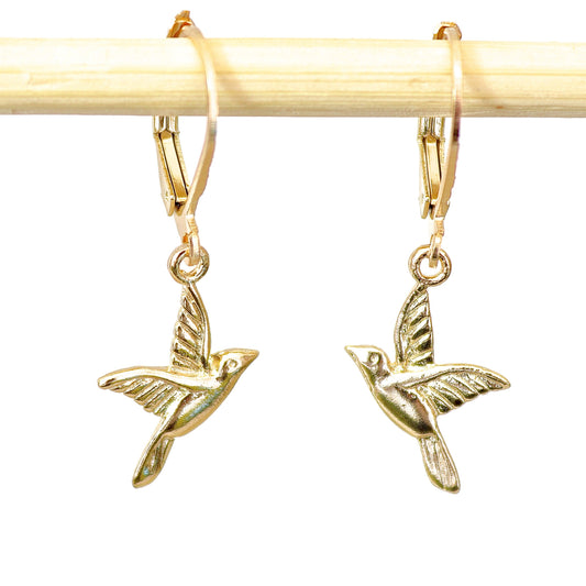 Bird solid 14k gold dangle earrings, Humming bird earrings
