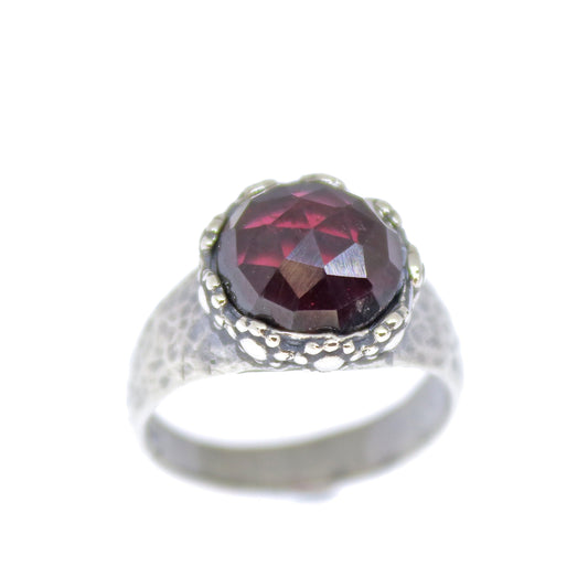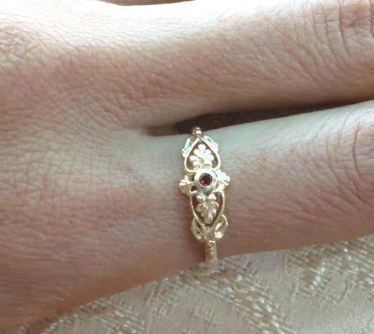 Garnet gold ring, Red stone solid 14k gold ring band, Hammered gold ring