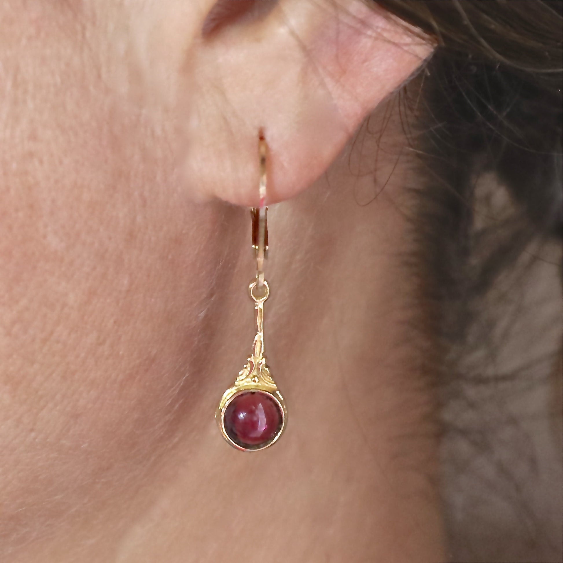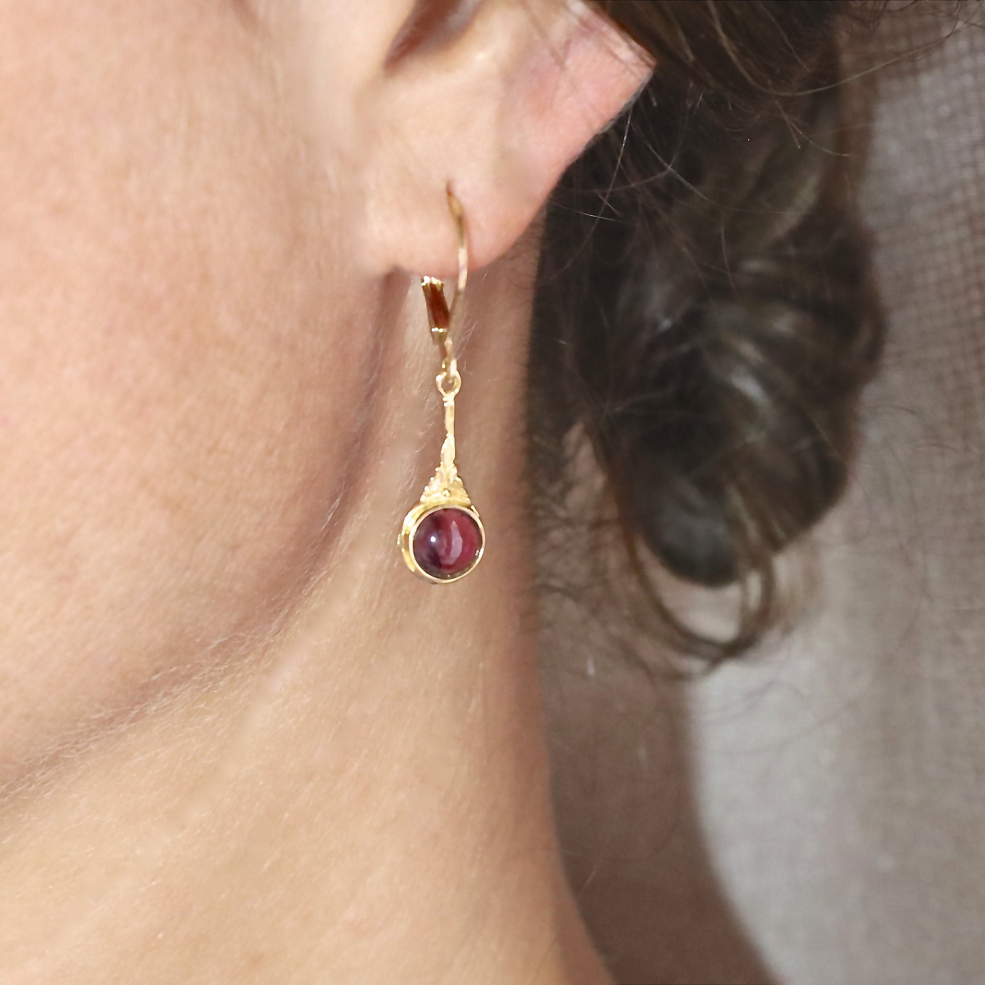 Garnet gold dangle earrings, Solid 14k gold victorian earrings