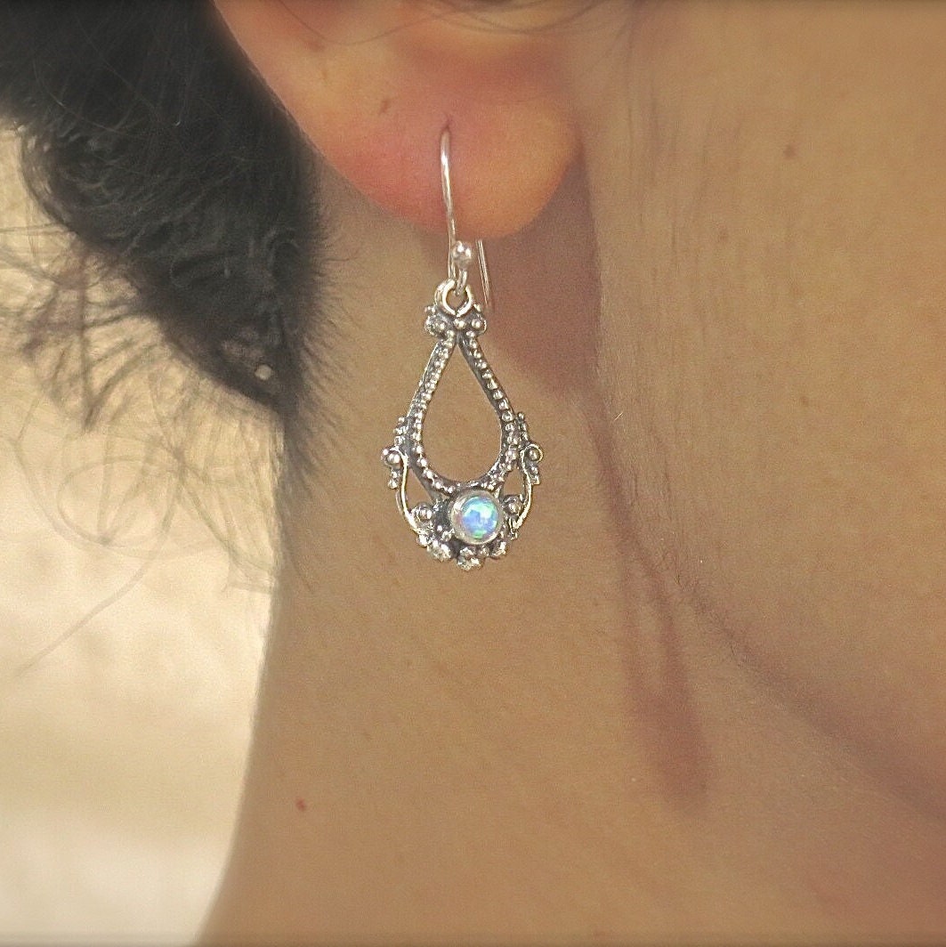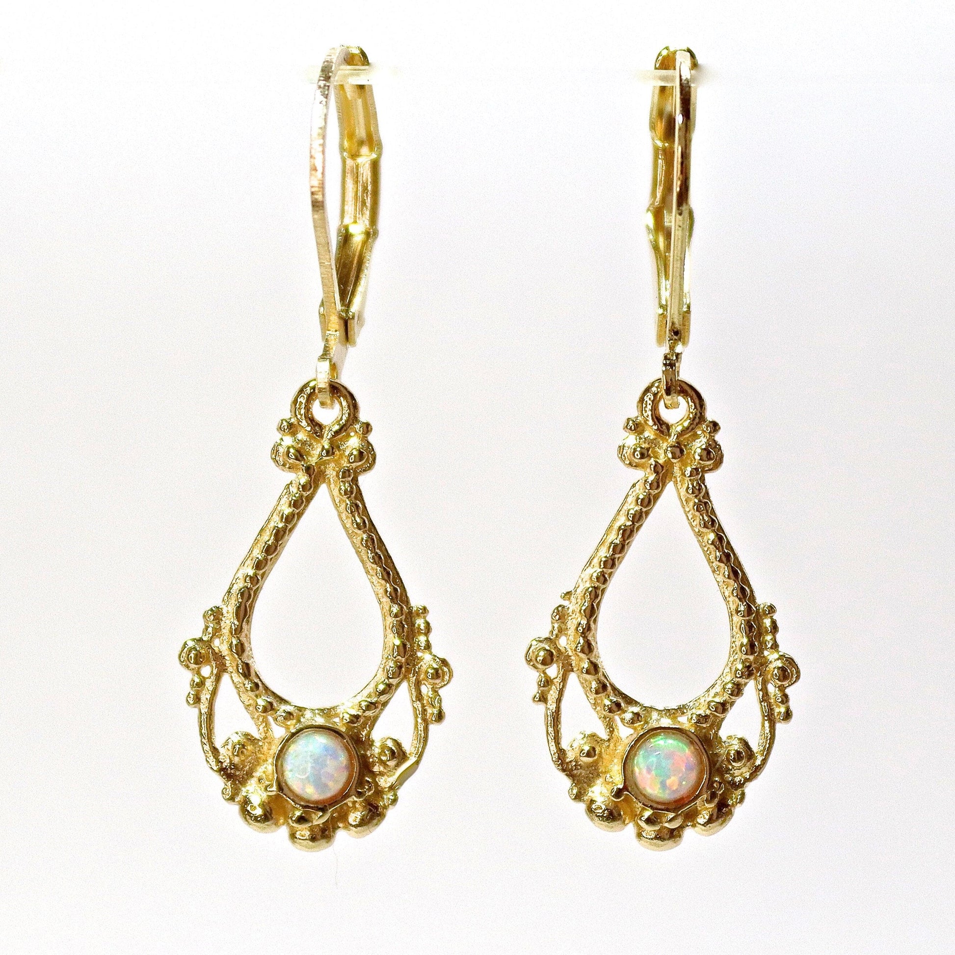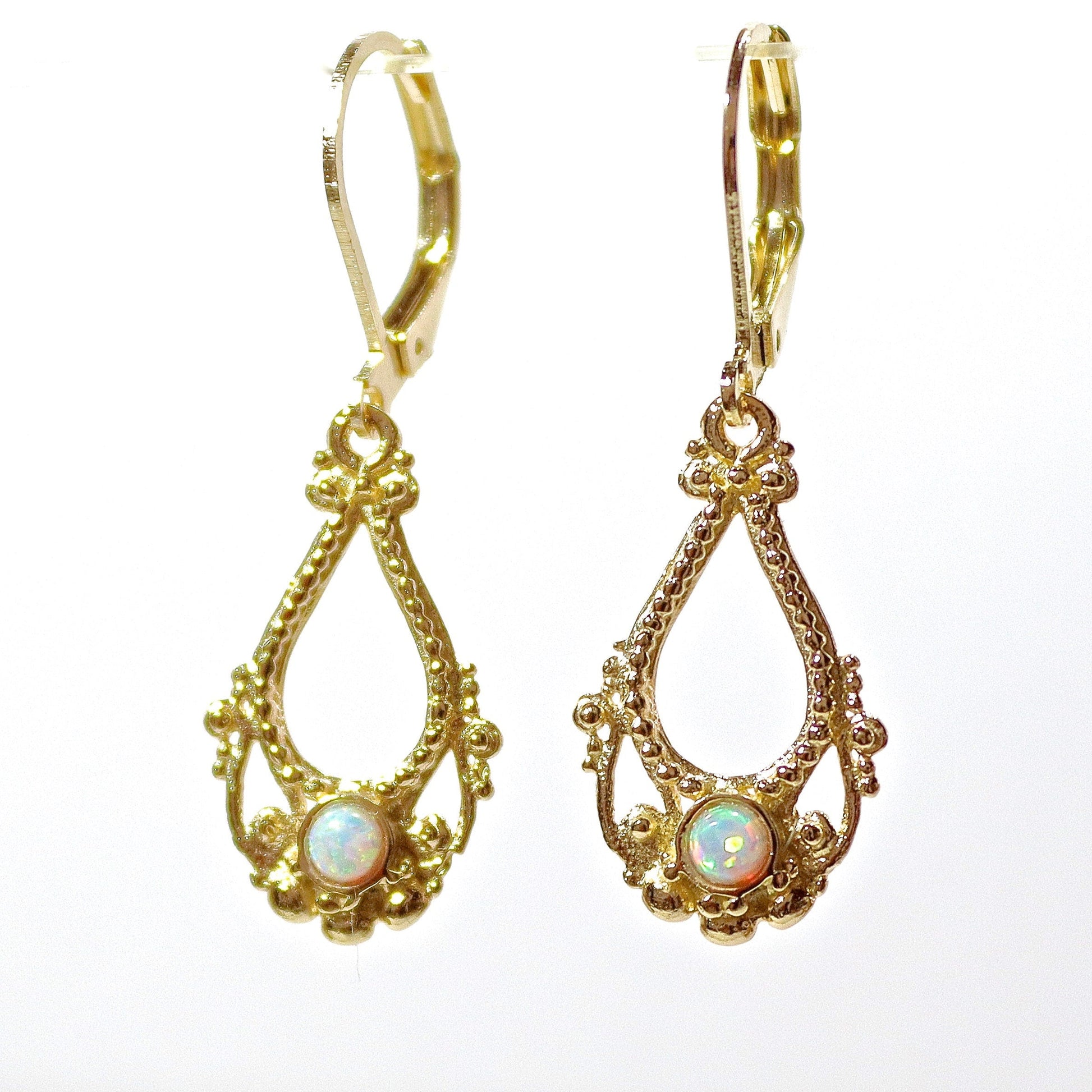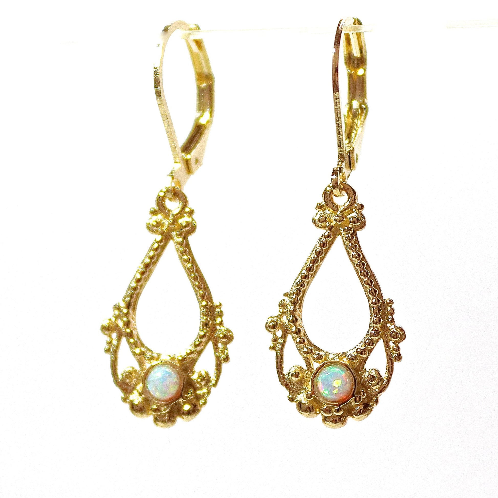 Opal earrings, Solid 14k gold dangle earring, White opal victorian style earringd
