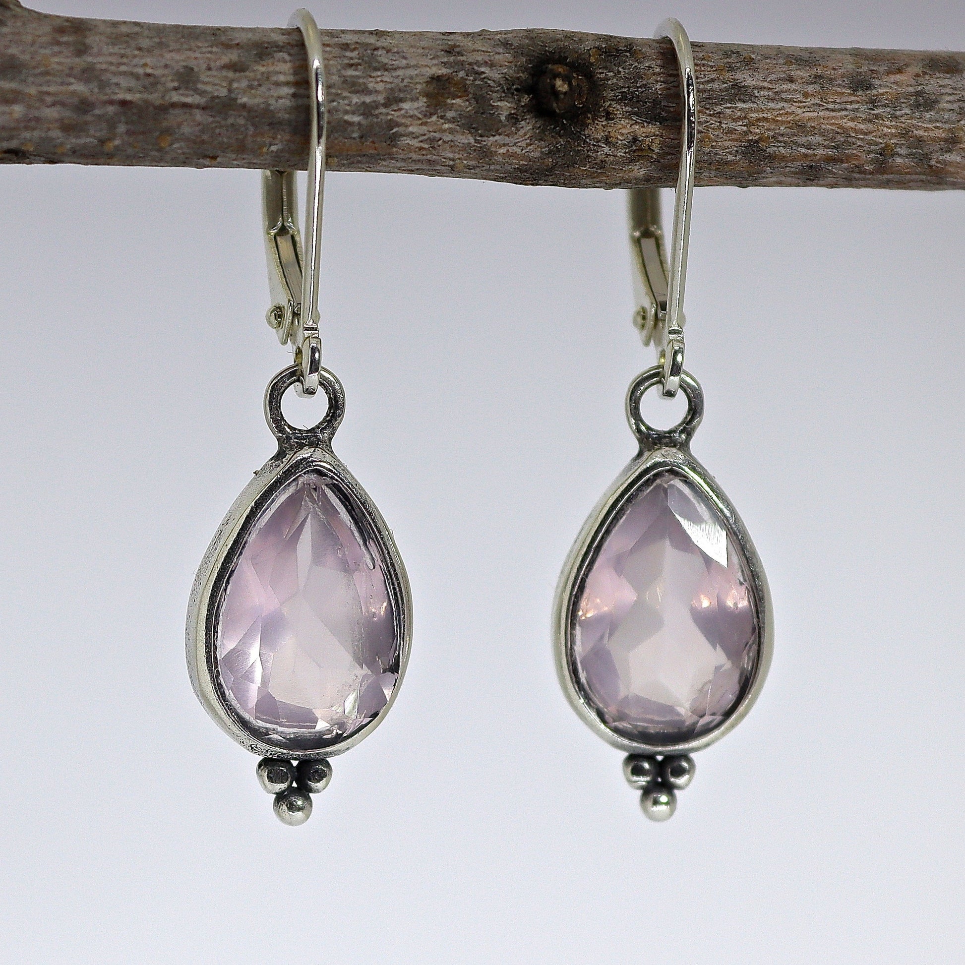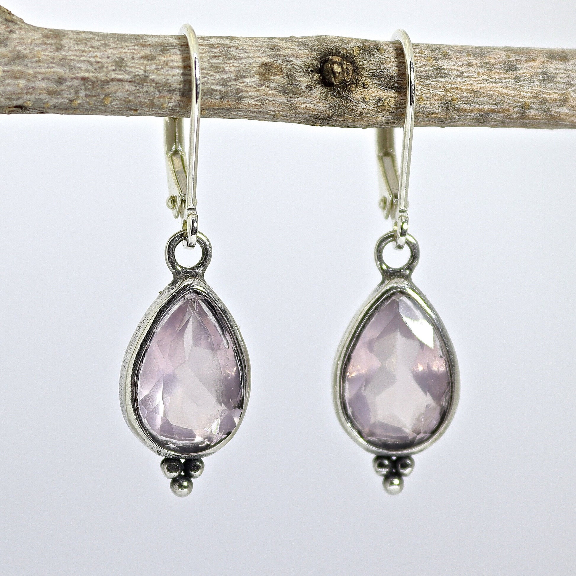 Rose quartz earrings, Teardrop pink stone silver dangle earrings