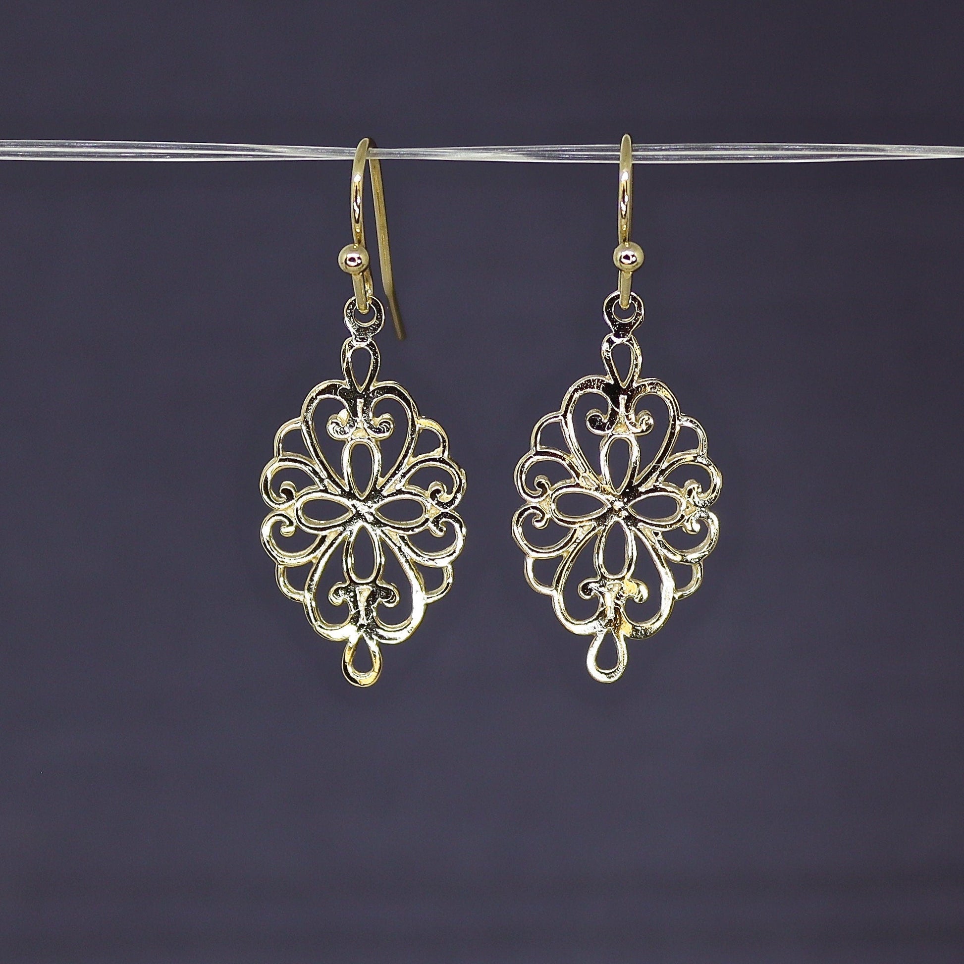 Solid gold filigree dangle earrings, 14k gold earrings, Victorian earrings