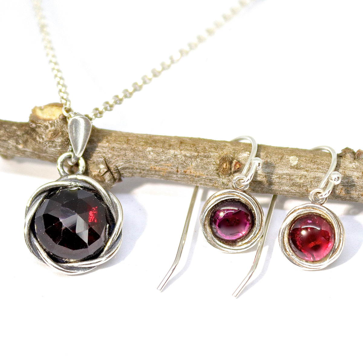 סט תכשיטי כסף : שרשרת ועגילים משובצים גארנט