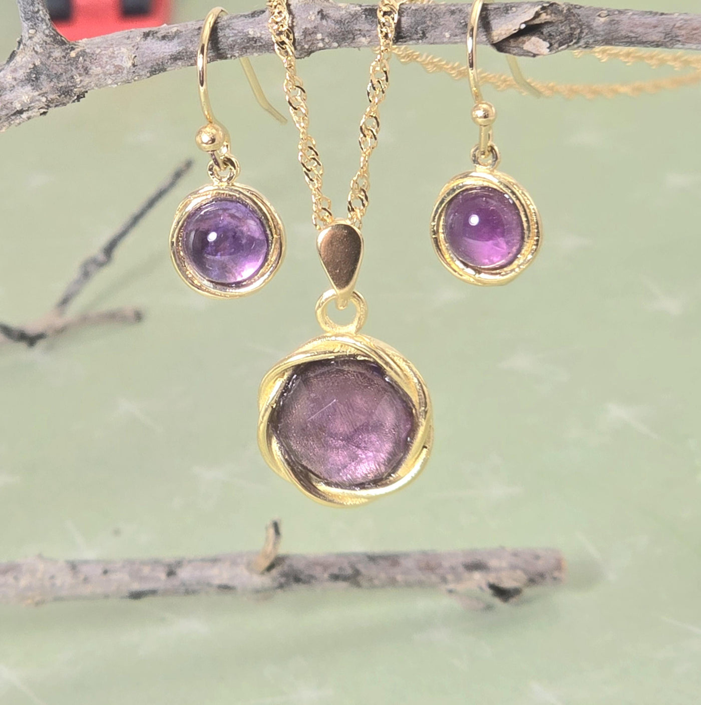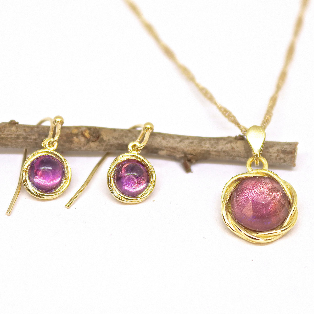 סט תכשיטי אמטיסט, עגילים ושרשרת ציפוי זהב