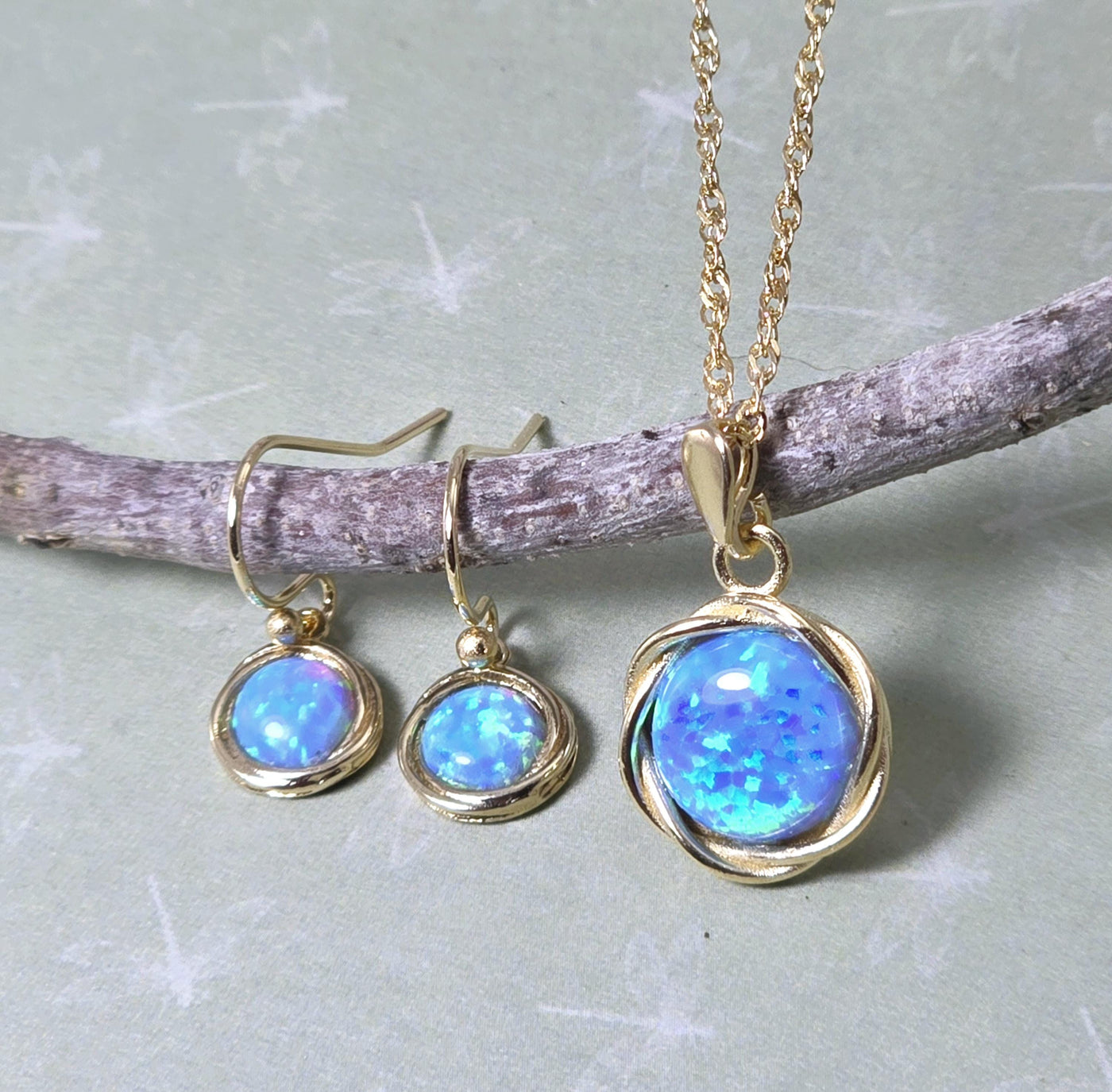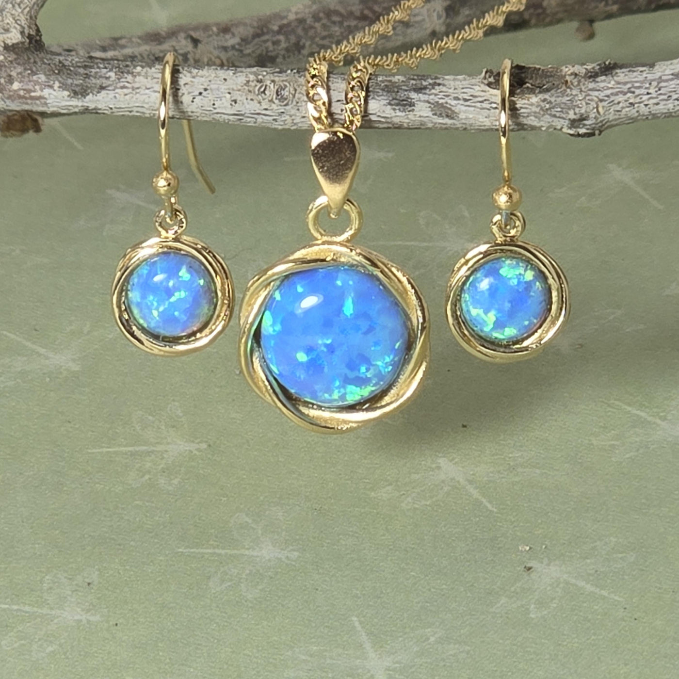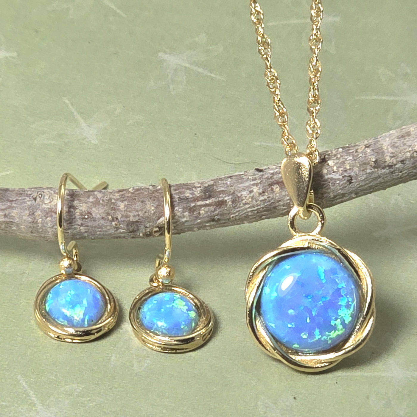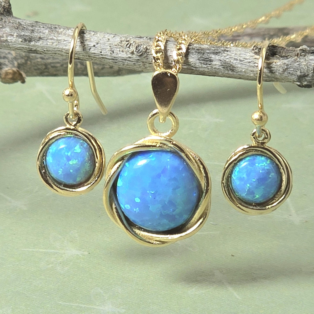 סט תכשיטי אופל כחול, עגילים ושרשרת ציפוי זהב