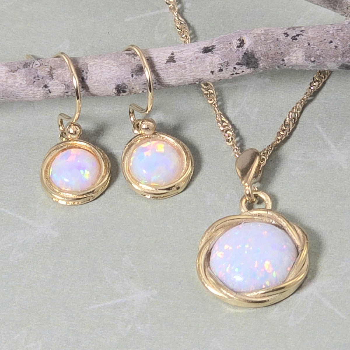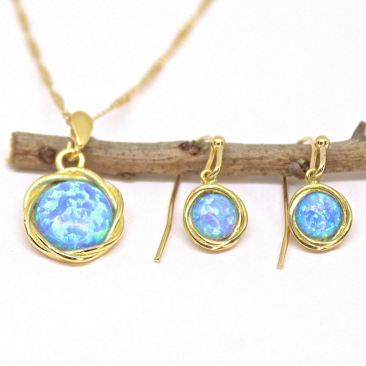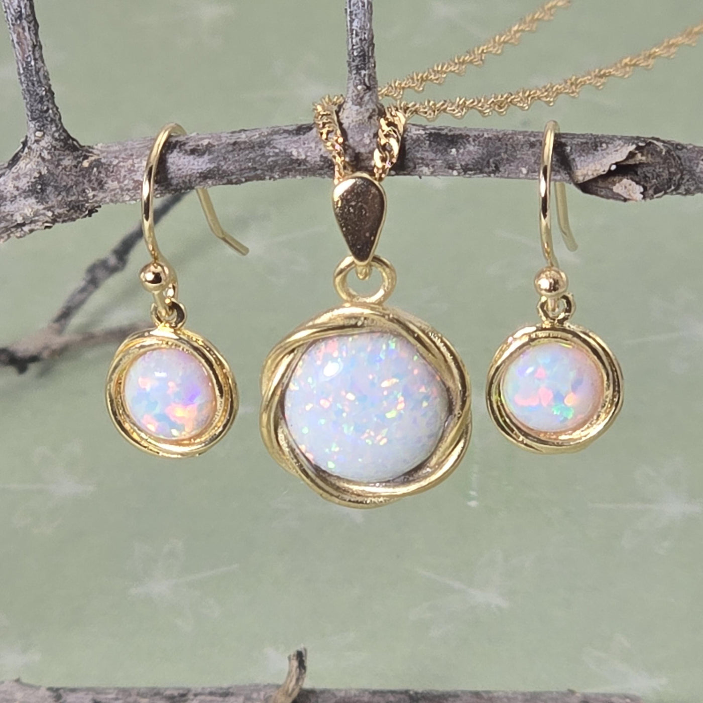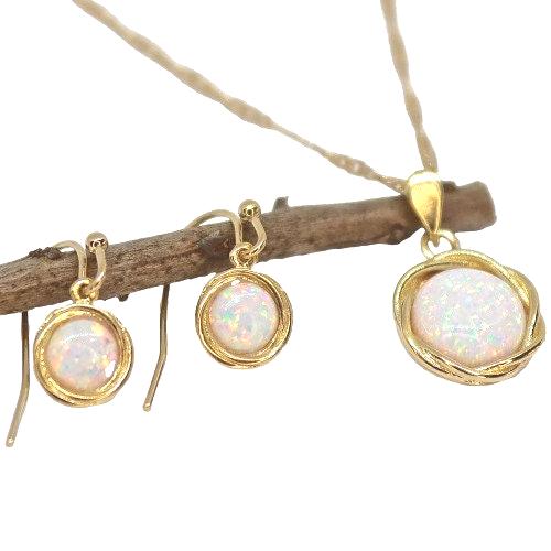 סט תכשיטים- עגילים ושרשרת ציפוי זהב בשיבוץ אופל לבן