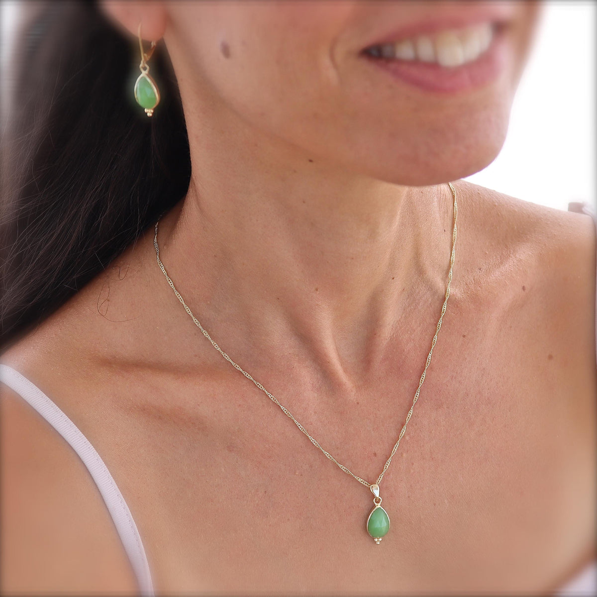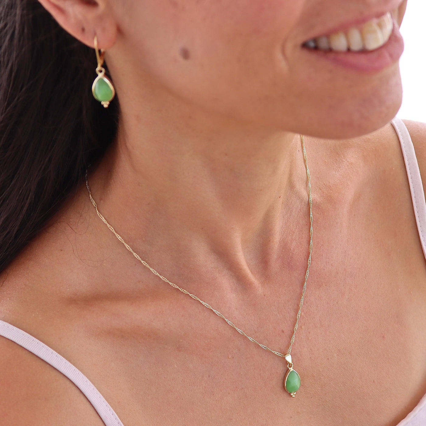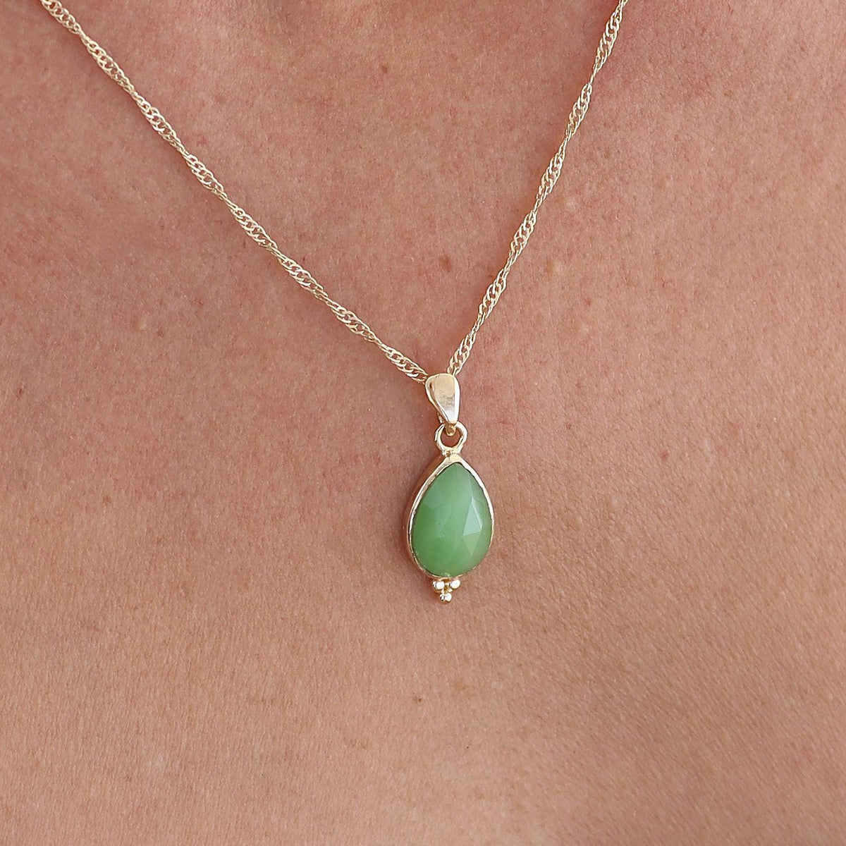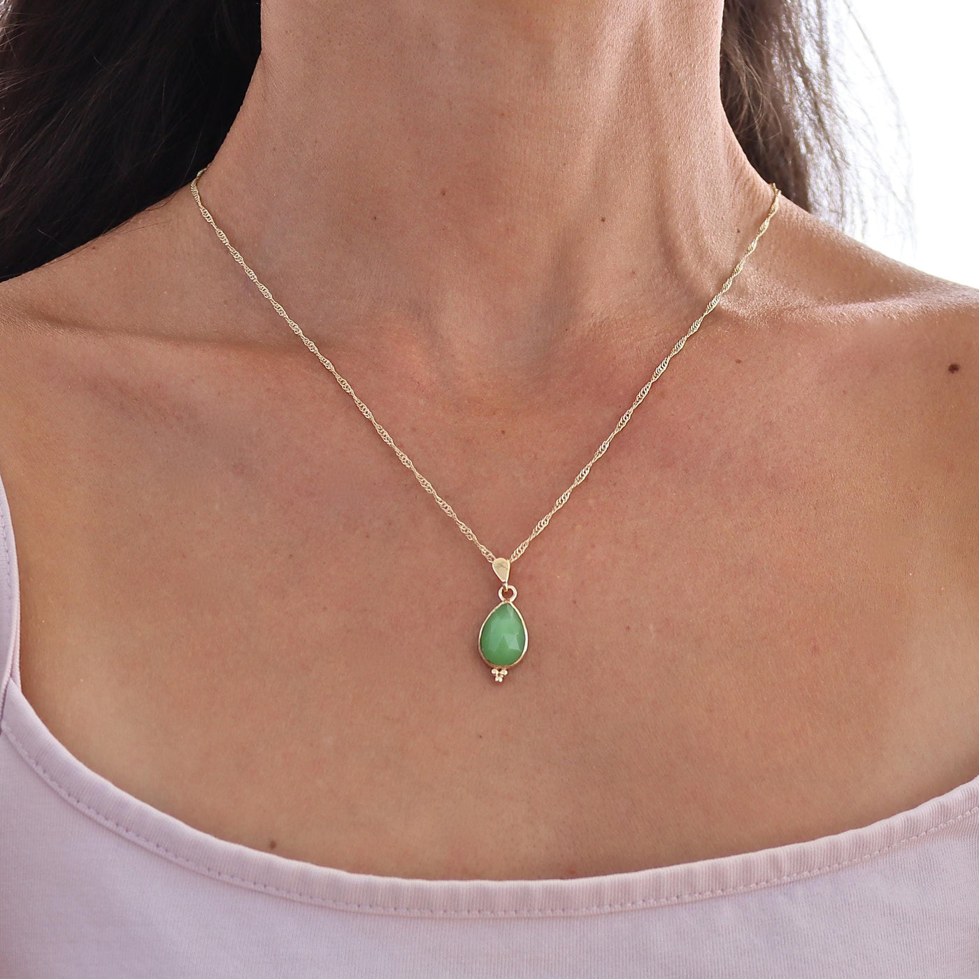 שרשרת תליון טיפה משובצת ג'ייד ירוק זהב מלא 14 קראט