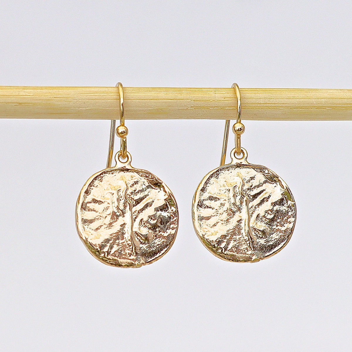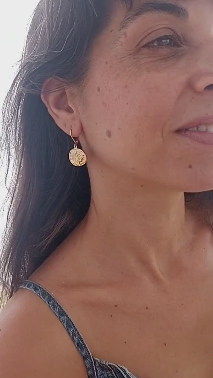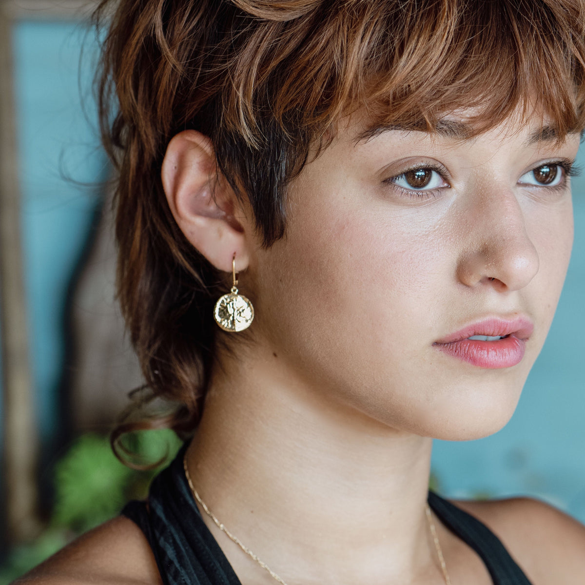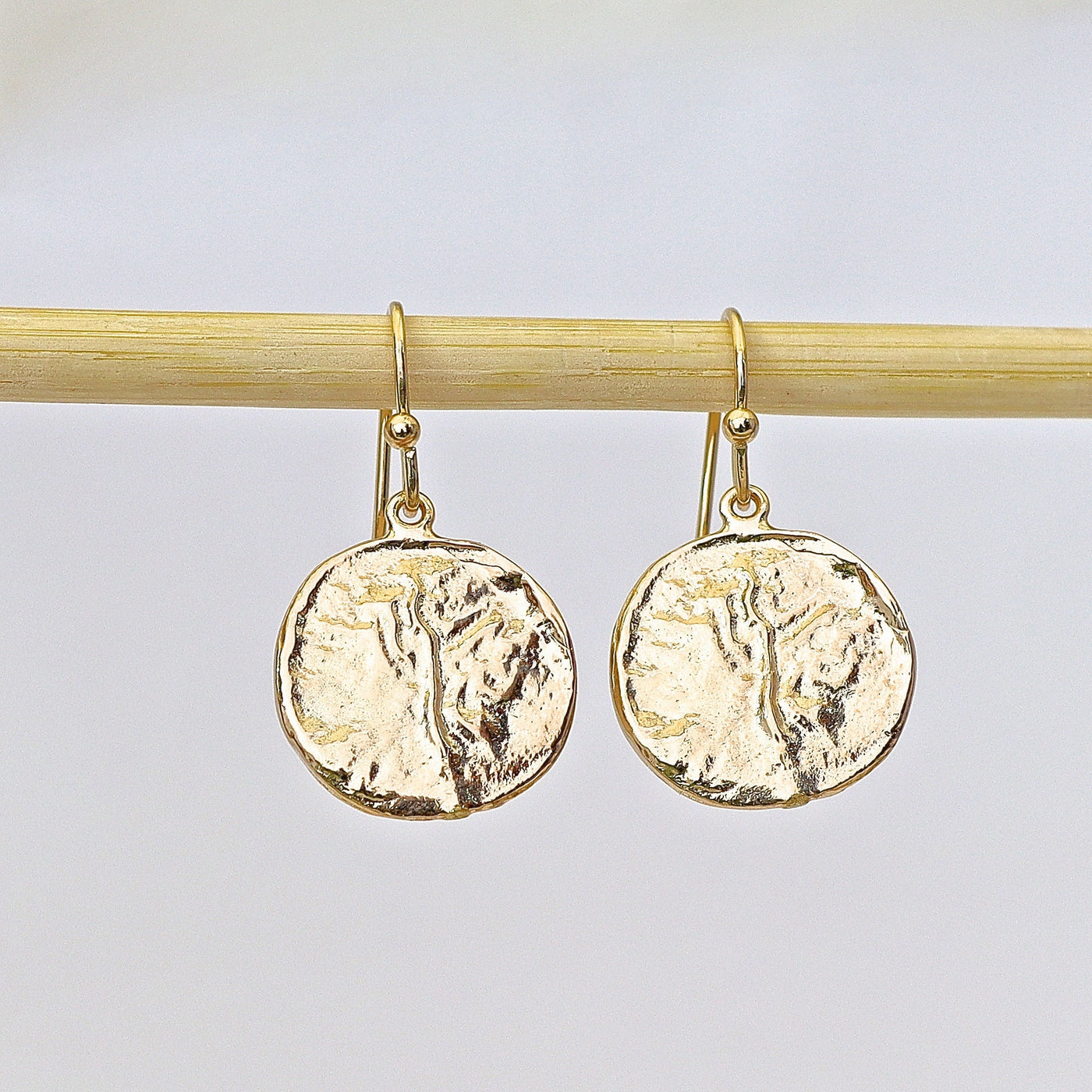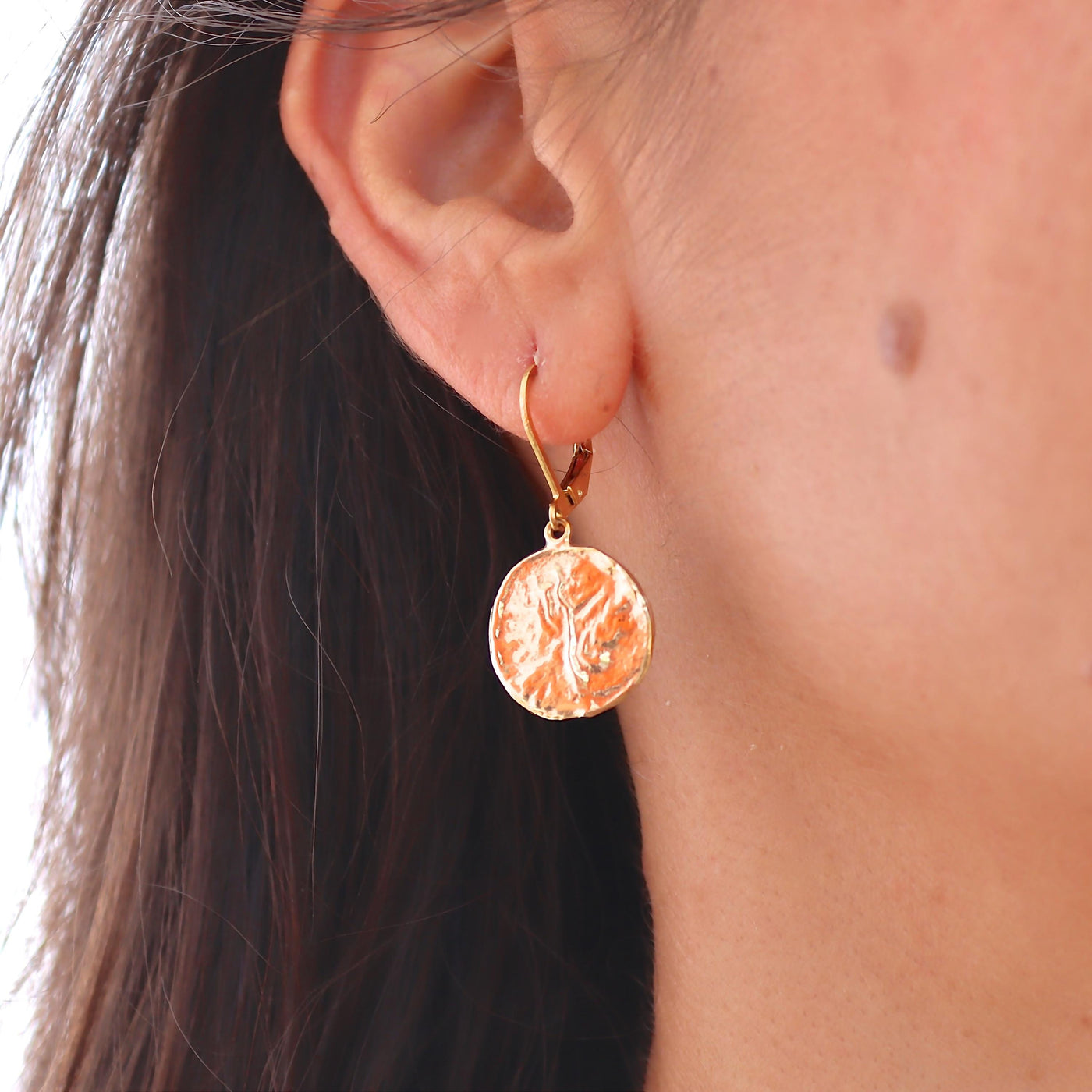 עגילי זהב אלגנטיים בצורת דיסק תלויים. תכשיטים אלה בצורת מטבע כוללים עיצוב עיגול נצחי וסגירות ידית מאובטחות לענידה קלה.