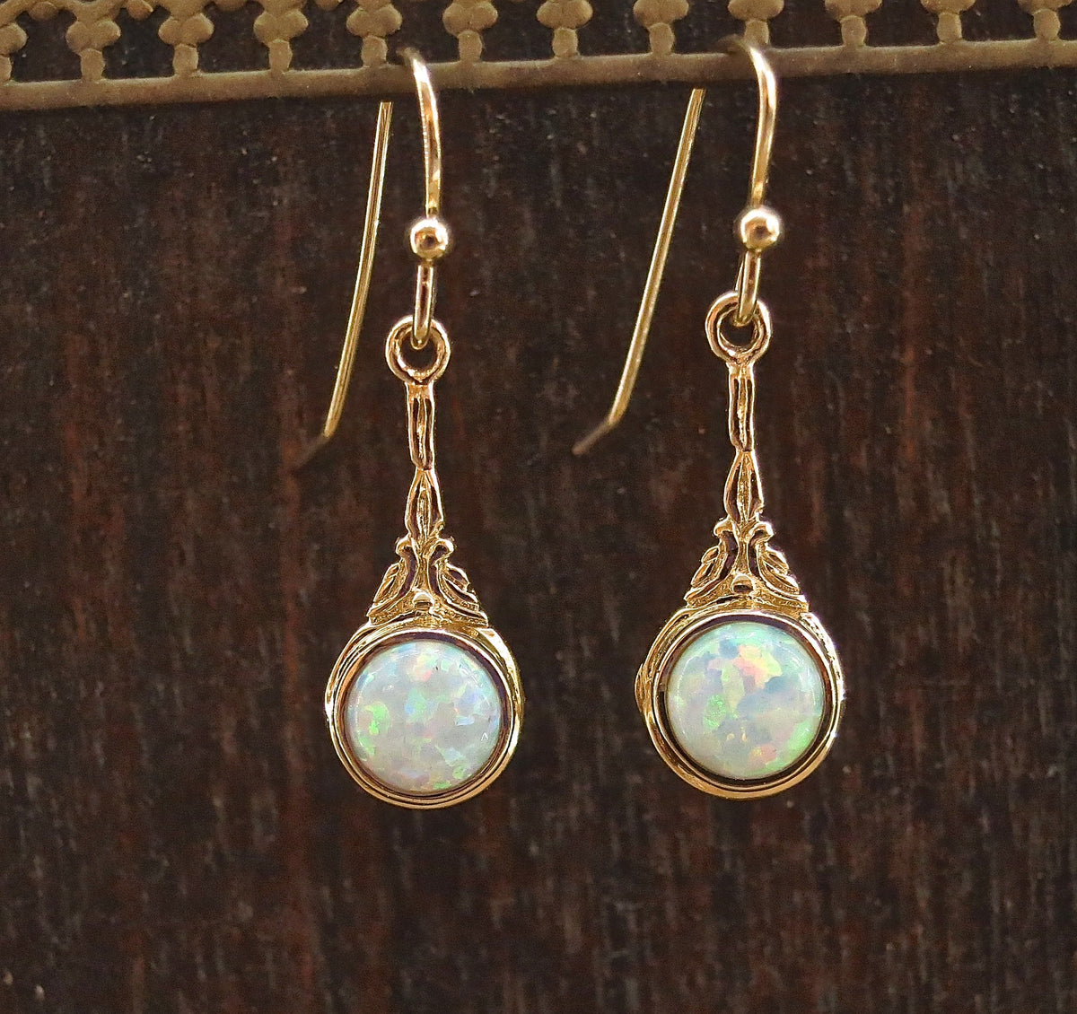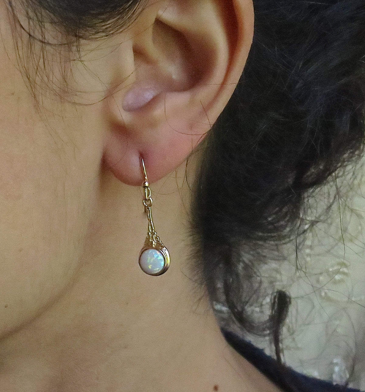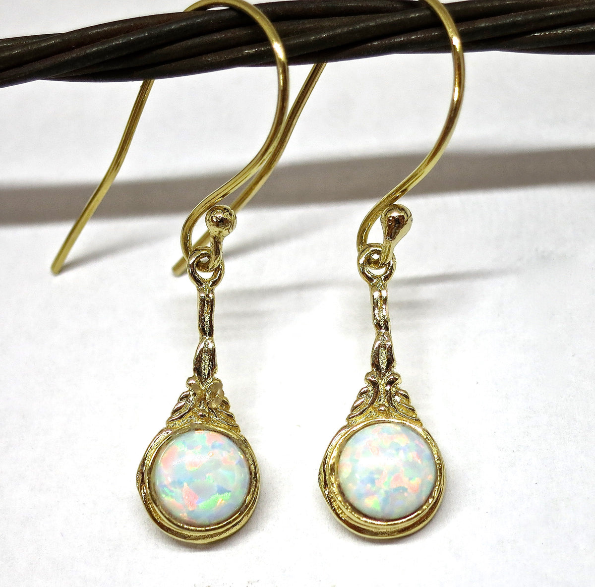 עגילי זהב ויקטוריאני 14 קראט עדינים, עגילי אופל לבן.