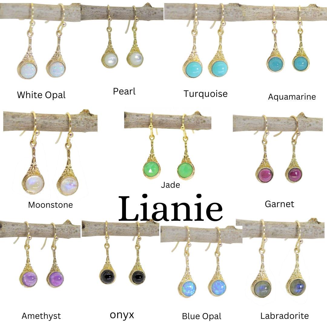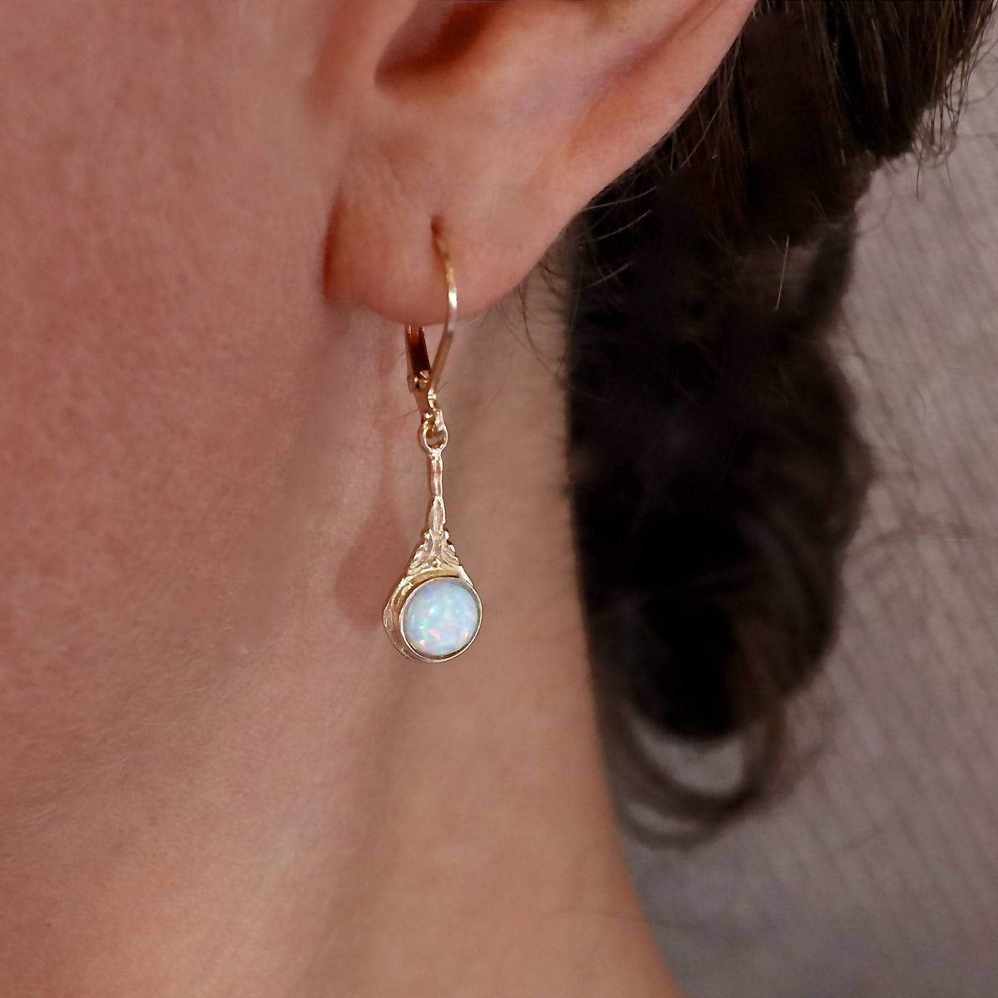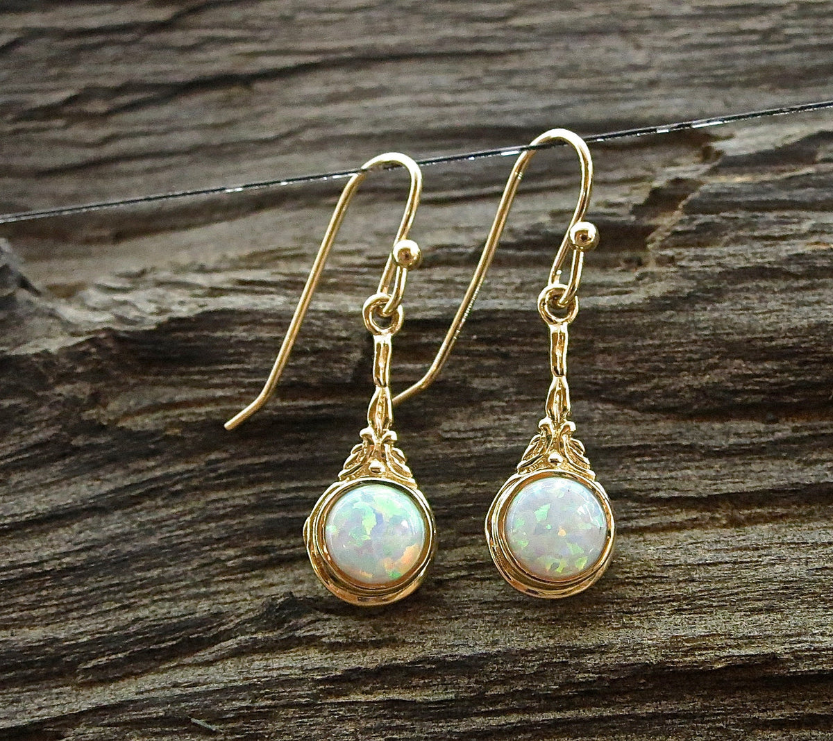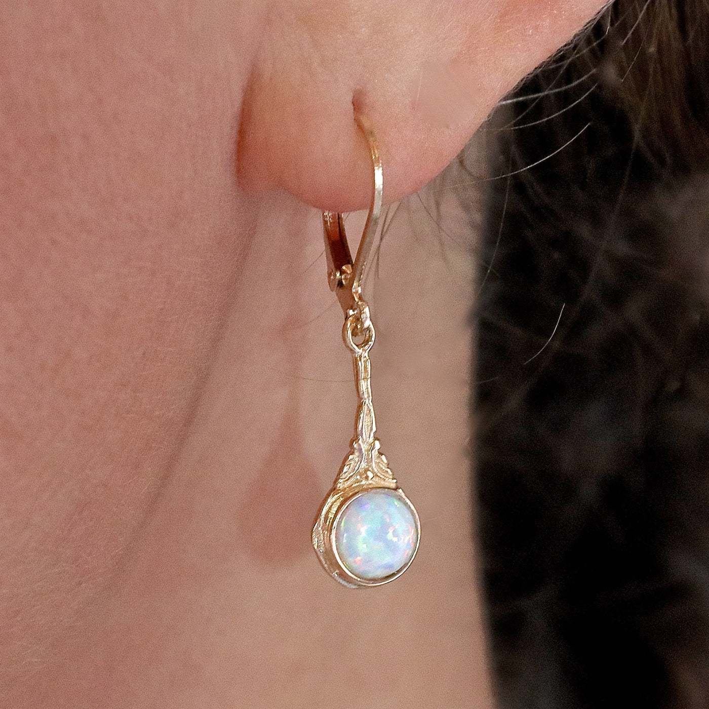 עגילי זהב ויקטוריאני 14 קראט עדינים, עגילי אופל לבן.