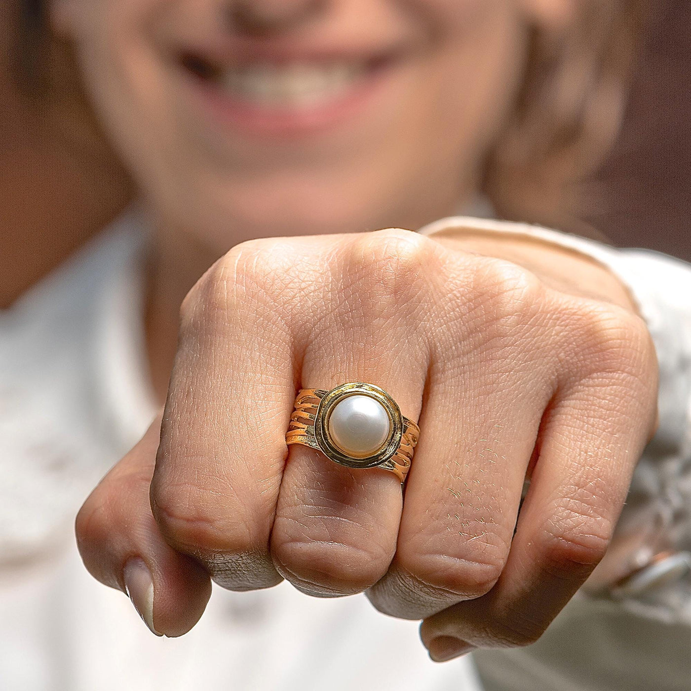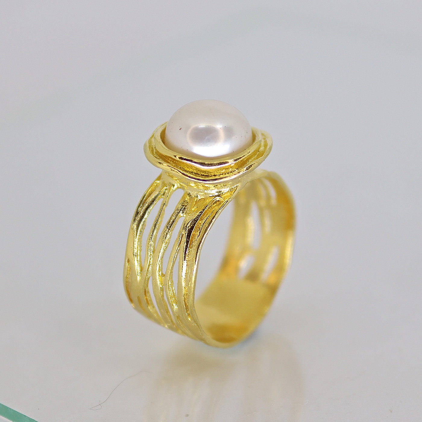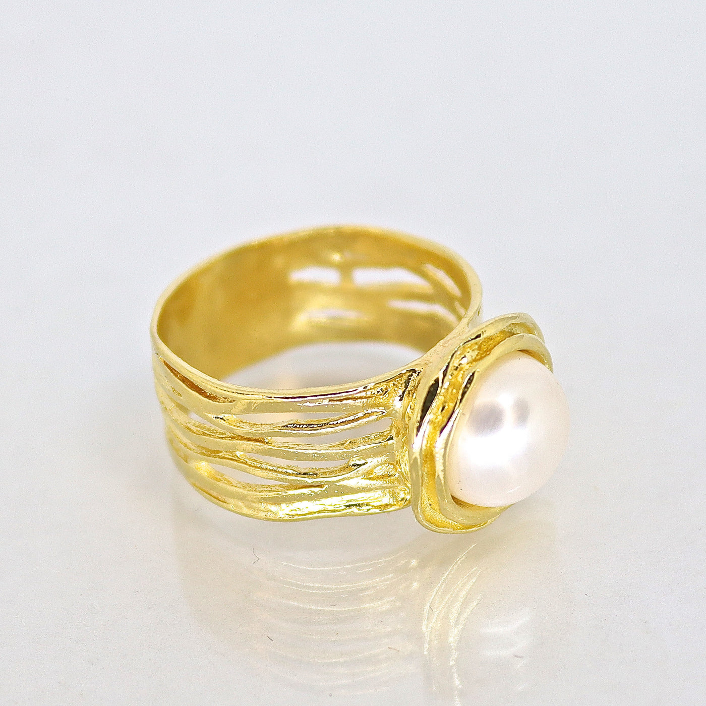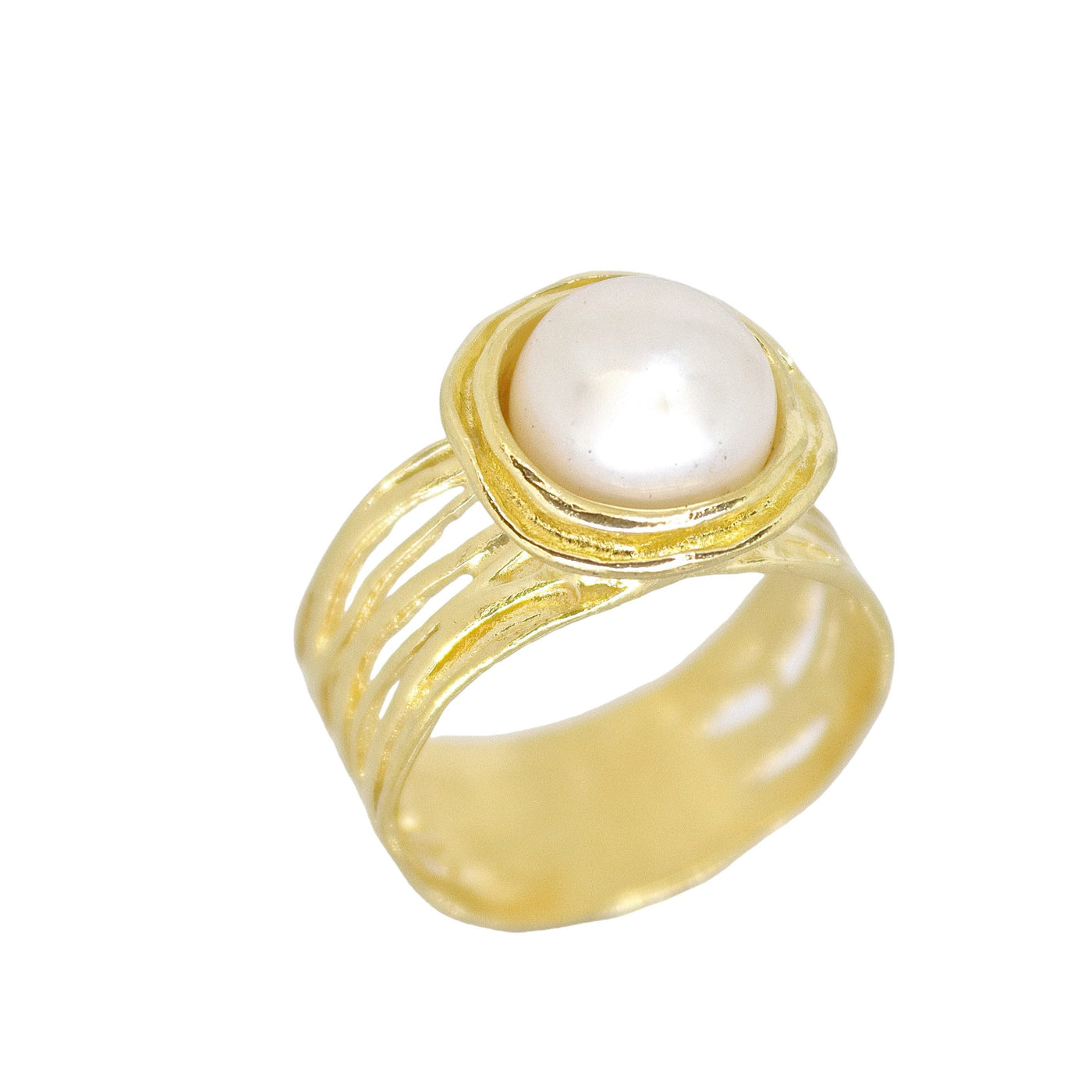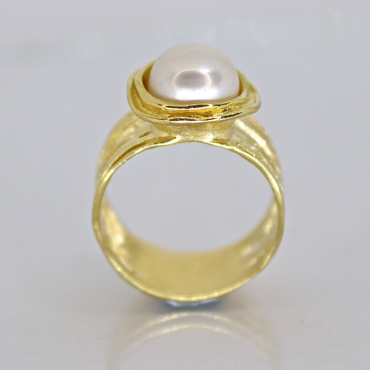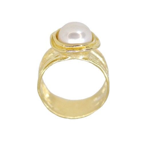 טבעת רחבה משובצת פנינה מזהב 14 קראט.