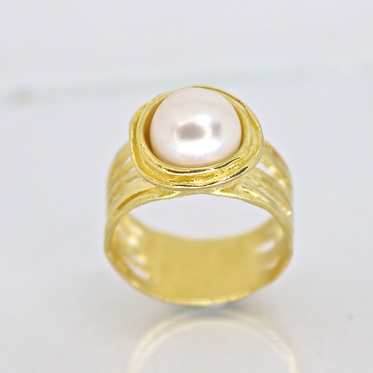 טבעת פנינה אלגנטית רחבה מזהב 14 קראט