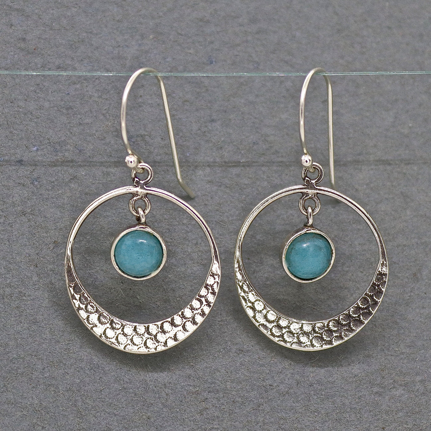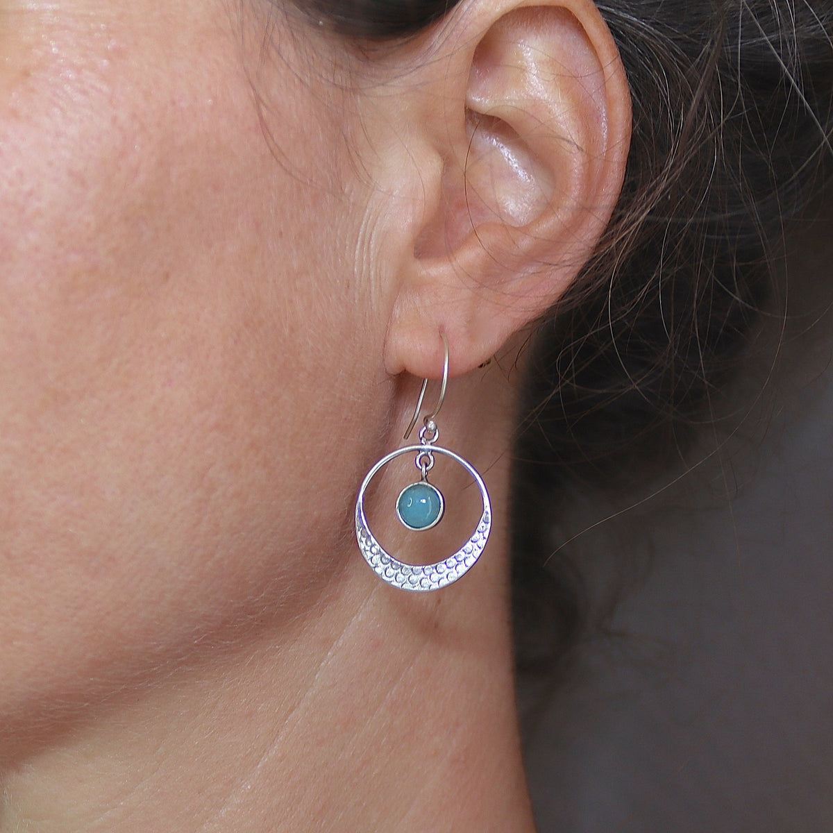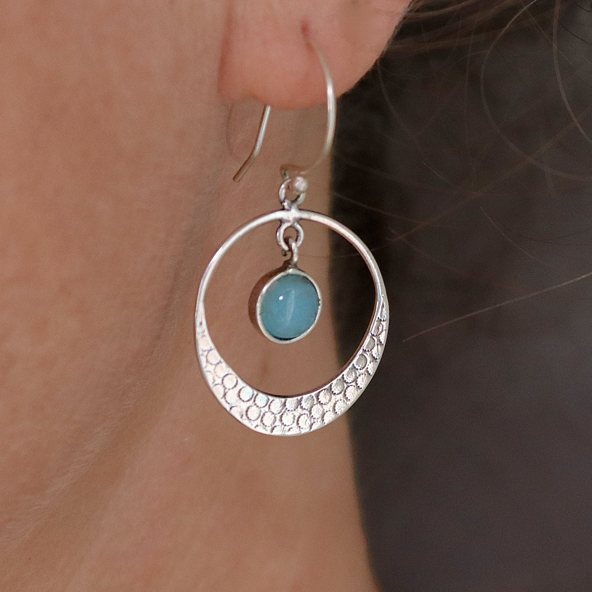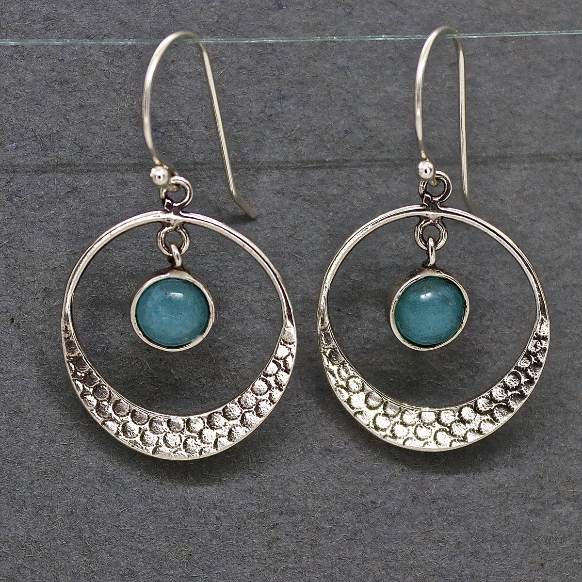 עגילי חישוק כסף תלויים אקוומרין בעבודת יד