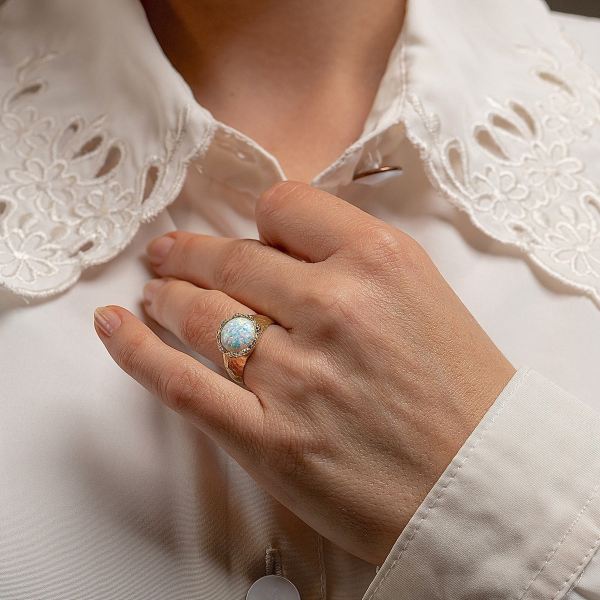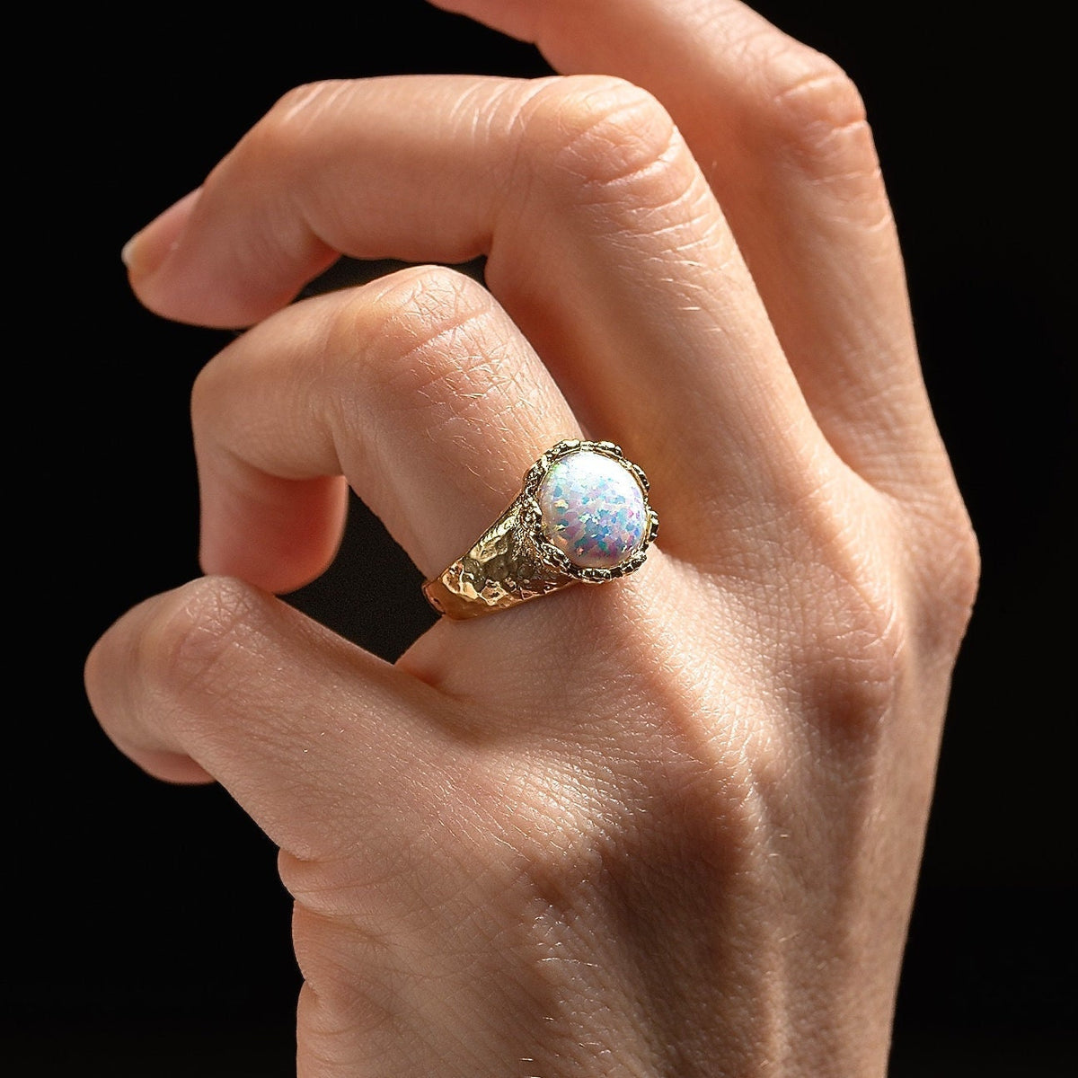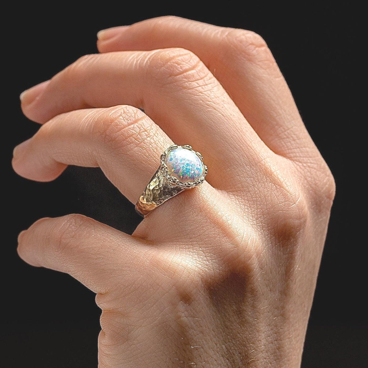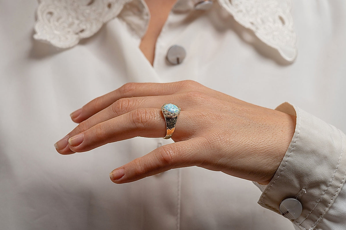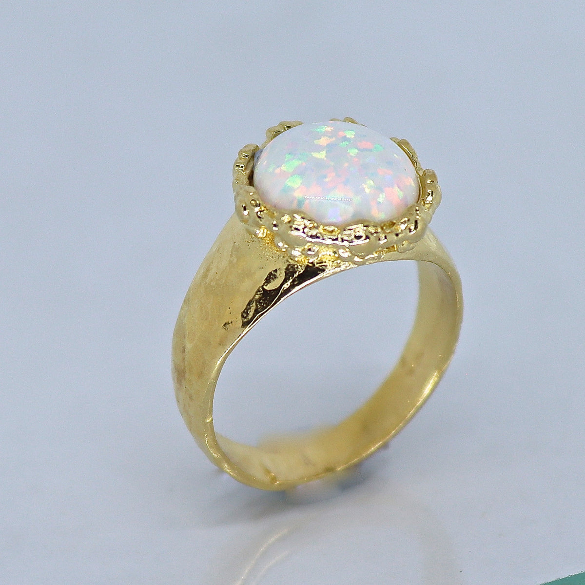 טבעת אופל לבנה גדולה מצופה זהב